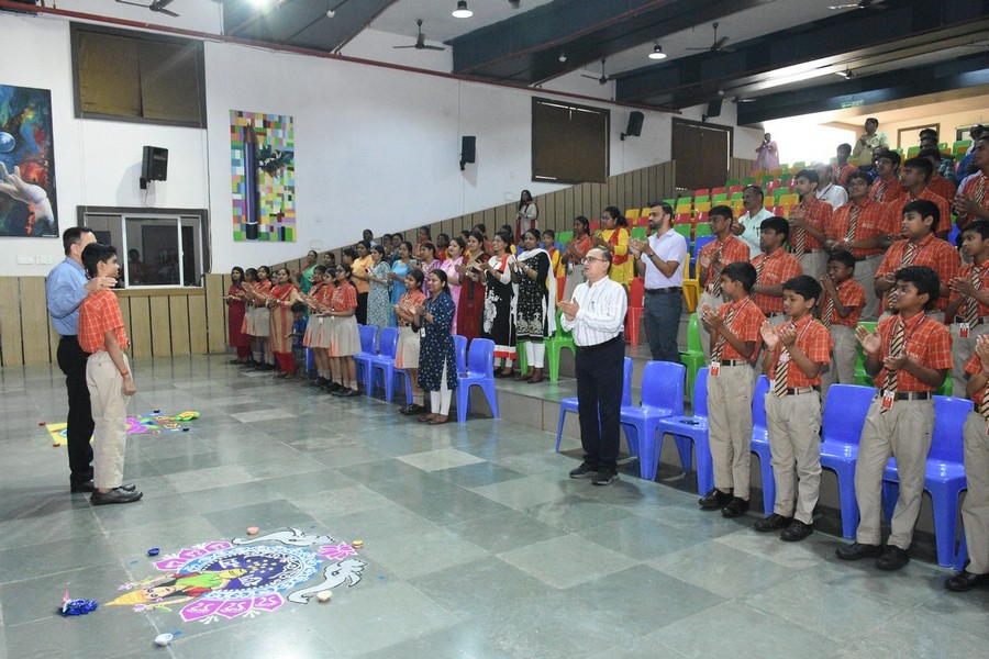 Led by the enthusiastic students of Grades IV to VIII, the assembly beautifully reflected the essence of Diwali — the victory of light over darkness and truth over evil. The morning commenced with a soulful prayer, followed by the word of the day, thought of the day, and insightful news updates from the global, national, and state fronts, setting a thoughtful tone for the celebration.